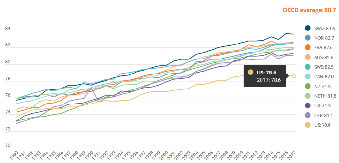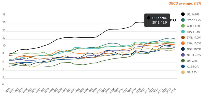 We in the US pay about twice per capita what those in other countries pay for healthcare, but despite the high cost, health outcomes here are poorer at every stage of life. We pay multiple times the cost for the same medications as they pay in other countries. Plus, we have millions of citizens without any care at all. Further, the major cause of bankruptcy is medical costs incurred by people who had insurance when they got sick. Most people would like this to change, and yet even the Democratic leadership says we can't afford it. Richest country in the world, richest in the history of the world, but we can't take care of people when they're sick.